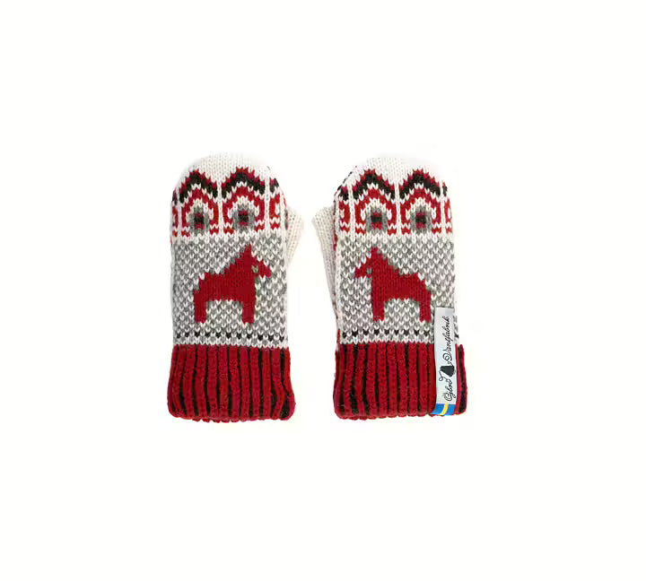 Dalarna Röd Liten, Lämplig för 0-2år. Denna 4 lagers ull tumvante är upp stickad i design Dalarna, som är inspirerad av den underbara dalahästen vi har i Sverige. En välkänd Sverigesymbol som är mönstersatt och färgsatt i färgglada traditionella färger.