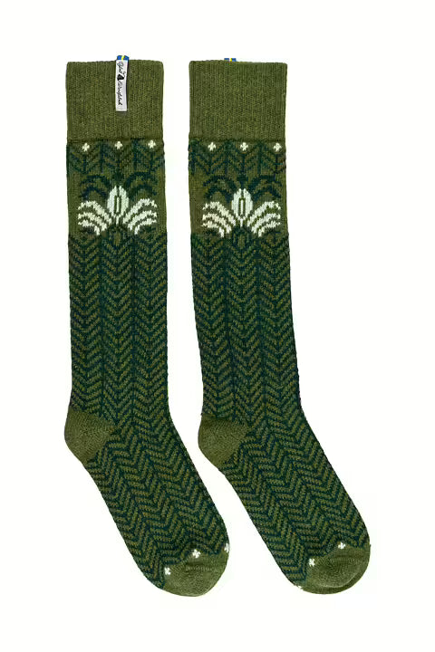 Fager Inez, denna knähöga ullsocka, som är inspirerad av alla de kvinnor som stickat olika vantar i stiliserade blommönster. Här har det tagits fasta på liljan som sedan färgsatts i traditionella färger.