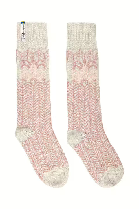 Fager Ingvild, denna knähöga ull socka är upp stickad i Öjbris design Fager, som är inspirerad av alla de kvinnor som stickat olika vantar i stiliserade blommönster. Här har dom tagit fasta på liljan som dom sedan har färgsatt i traditionella färger