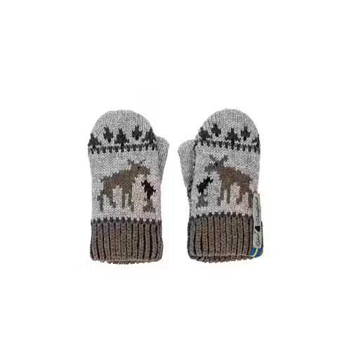 Skogen Liten, Lämplig för 0-2år. 4 lagers tumvante som är stickad i design Skogen, som är inspirerad av allas vår allemansrätt. Här gestaltad av skogens konung Älgen i samspråk med korpen. Mönster satt och färgsatt i naturens färger